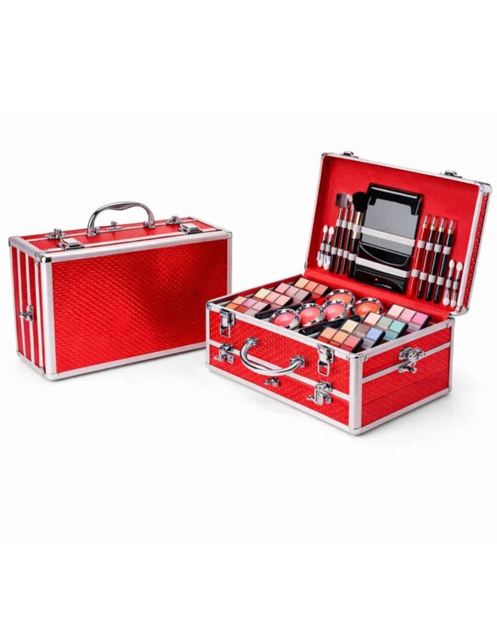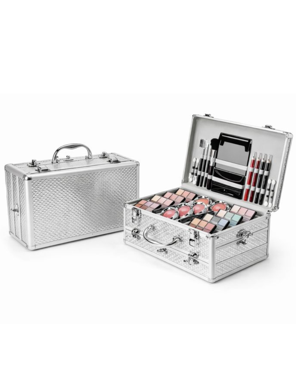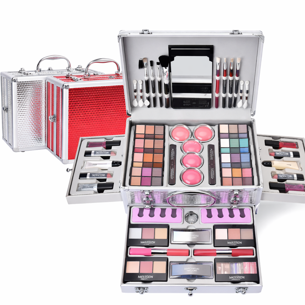 A maleta em alumínio resistente , com divisórias bem distribuídas, permite fácil visualização e acesso aos produtos, oferecendo uma experiência completa de beleza em um único kit.