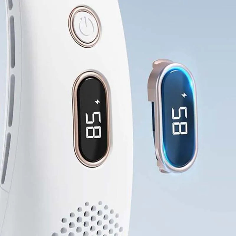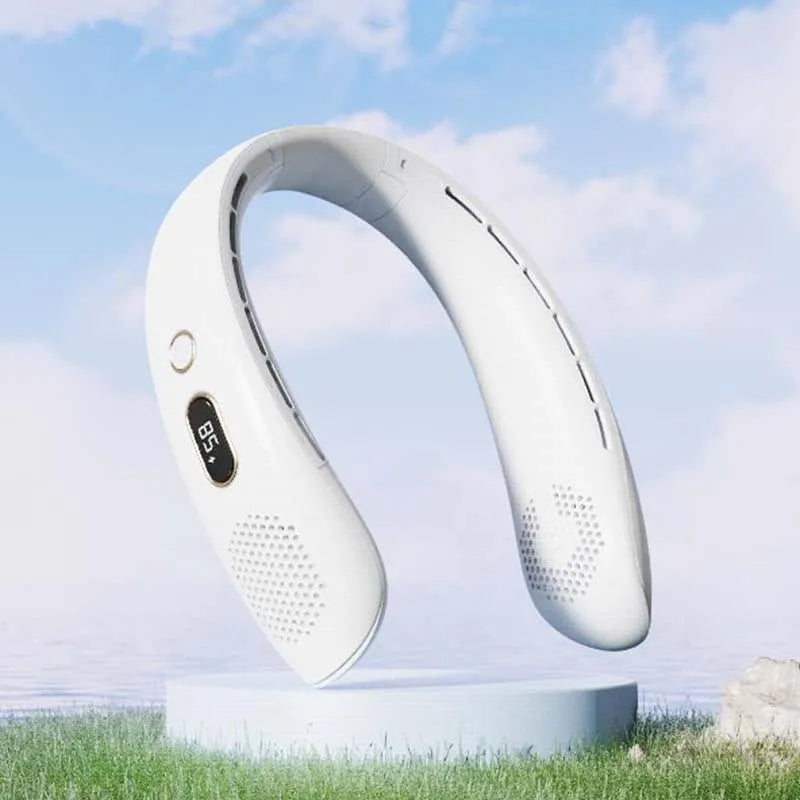 Este ventilador de pescoço sem lâminas adota um design sem lâminas, que transmite o vento para o rosto através da turbina interna, e é mais seguro sem prender os cabelos.